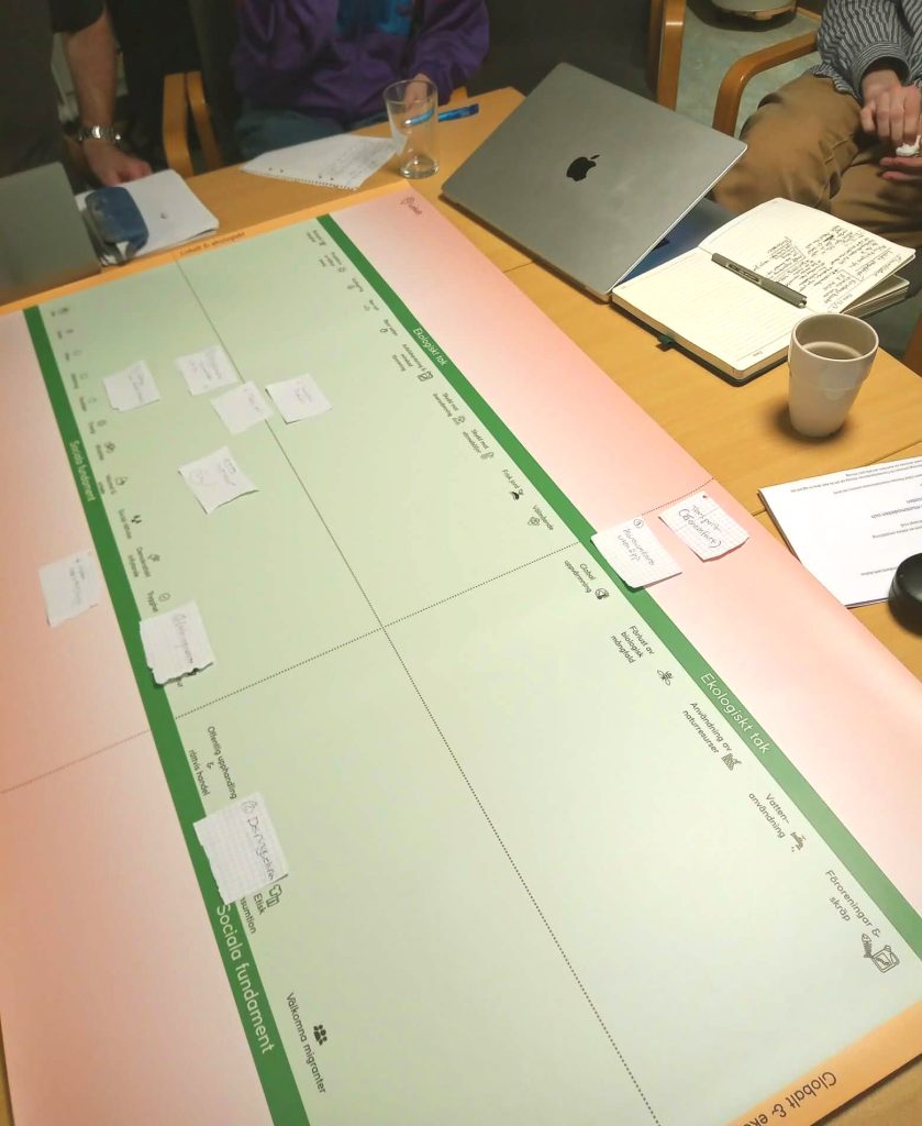 Genom att visualisera samhällsfrågor som antingen innanför eller utanför hållbarhetens gränser såg vi utveckling på ett sätt som vi inte är vana vid. Kommunens utmaningar och möjligheter relaterades inte till de vanliga, linjära modellerna där fokus ofta ligger på ekonomisk lönsamhet eller annan ensidig tillväxt. Kartläggningen visade istället hur ökad välfärd är möjlig, men alltid står i relation till andra faktorer. Detta fångas knappast genom grafer över enskilda förändringar, isolerade linjer ständigt pekande åt höger. Modellen skapade diskussioner om var vi är nu och vart vi vill, diskussioner som inte förs när man utgår från tillväxtmodeller.